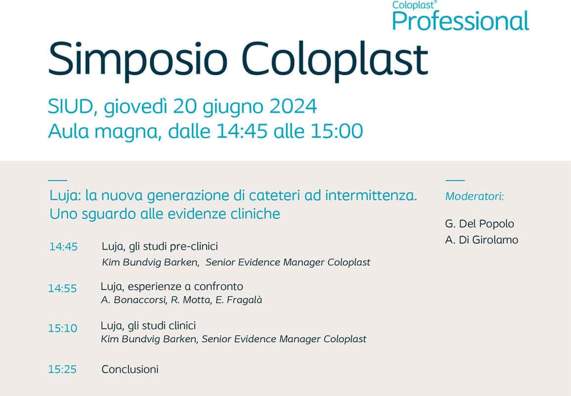 In questa pagina potrai trovare le informazioni relative al Simposio Coloplast che si terrà giovedì 20 giugno durante il Congresso SIUD, in aula magna, dalle 14:45 alle 15:30